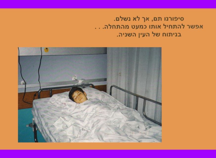 תומר קיבל מיטה ענקית, וגם פיג'מה יפה וצבעונית. ההורים נרגשים, וגם תומר מתוח. מחר בבוקר זהו יום הניתוח.